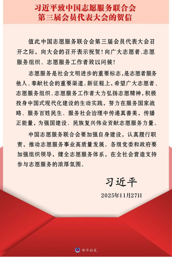 习近平致信祝贺中国志愿服务联合会第三届会员代表大会召开强调 大力弘扬志愿精神传递真善美传播正能量 为强国建设民族复兴伟业贡献志愿服务力量 在中国志愿服务联合会第三届会员代表大会召开之际,中共中央总书记、国家主席、中央军委主席习近平发来贺信,向大会的召开表示祝贺,向广大志愿者、志愿服务组织、志愿服务工作者致以问候。 习近平在贺信中指出,志愿服务是社会文明进步的重要标志,是志愿者服务他人、奉献社会的重要渠道。新征程上,希望广大志愿者、志愿服务组织、志愿服务工作者大力弘扬志愿精神,积极投身中国式现代化建设的生动实践,努力在服务国家战略、服务百姓民生、服务社会治理中传递真善美,传播正能量,为强国建设、民族复兴伟业贡献志愿服务力量。 习近平强调,中国志愿服务联合会要加强自身建设,认真履行职责,推动志愿服务事业高质量发展。各级党委和政府要加强组织领导,健全志愿服务体系,在全社会营造支持参与志愿服务的浓厚氛围。 中国志愿服务联合会第三届会员代表大会11月27日至28日在京召开,会上宣读了习近平的贺信。 中国志愿服务联合会成立于2013年12月,是由志愿服务组织、志愿者以及相关单位、组织和个人自愿结成的全国性、联合性、非营利性社会组织,多年来为推动我国志愿服务事业发展作出了积极贡献。 习近平致中国志愿服务联合会 第三届会员代表大会的贺信 值此中国志愿服务联合会第三届会员代表大会召开之际,向大会的召开表示祝贺!向广大志愿者、志愿服务组织、志愿服务工作者致以问候! 志愿服务是社会文明进步的重要标志,是志愿者服务他人、奉献社会的重要渠道。新征程上,希望广大志愿者、志愿服务组织、志愿服务工作者大力弘扬志愿精神,积极投身中国式现代化建设的生动实践,努力在服务国家战略、服务百姓民生、服务社会治理中传递真善美,传播正能量,为强国建设、民族复兴伟业贡献志愿服务力量。 中国志愿服务联合会要加强自身建设,认真履行职责,推动志愿服务事业高质量发展。各级党委和政府要加强组织领导,健全志愿服务体系,在全社会营造支持参与志愿服务的浓厚氛围。 习近平 2025年11月27日